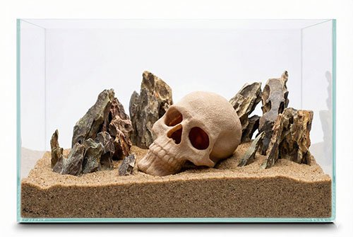 Este modelo remete à metade de um crânio humano, cuidadosamente posicionado deitado sobre o substrato. Sua forma cria um esconderijo sutil e elegante para espécies micro-territoriais, incentivando comportamento natural de abrigo. A peça equilibra estética e função — atuando como ponto focal sem dominar o espaço de um aquário pequeno ou médio